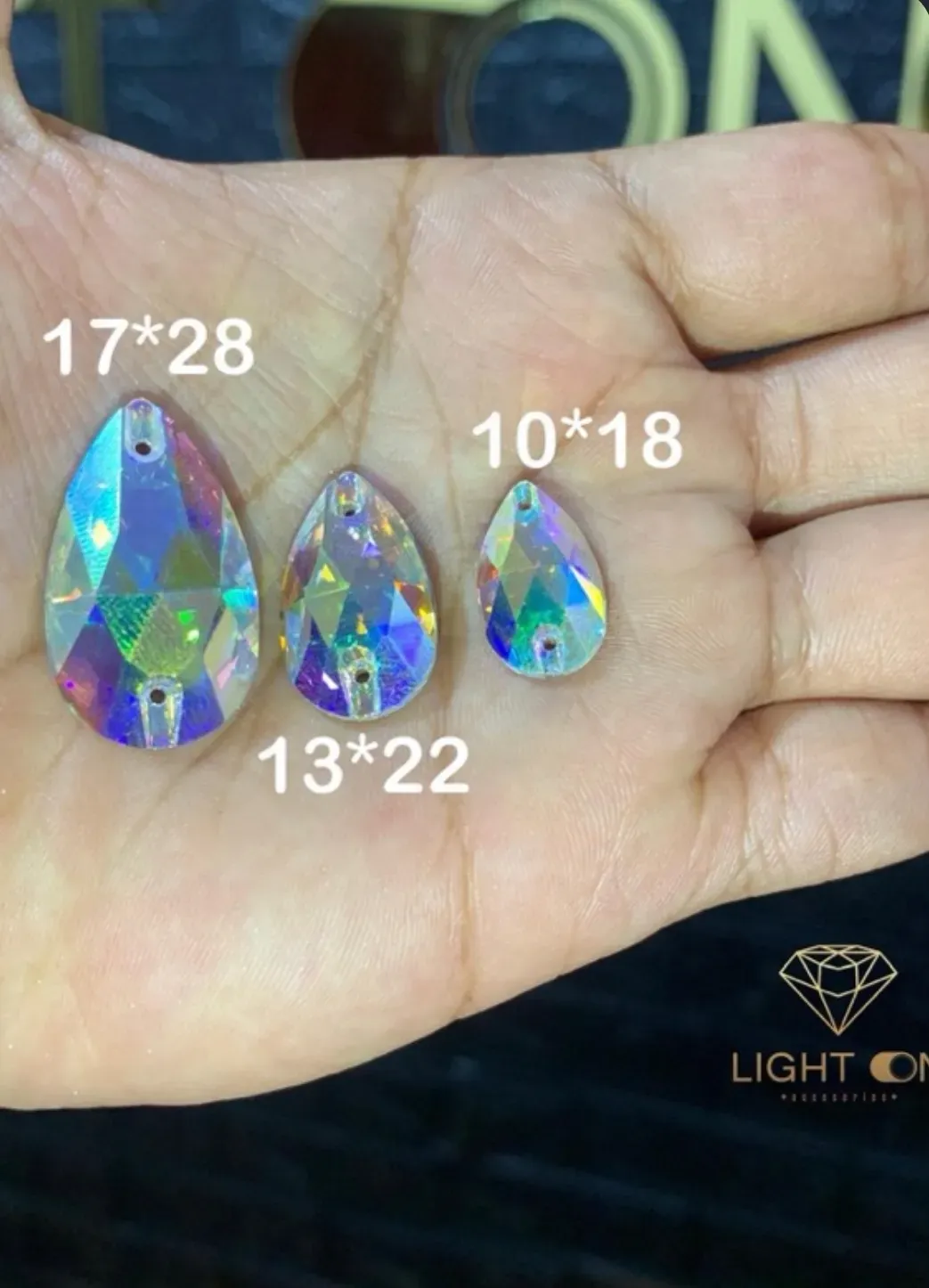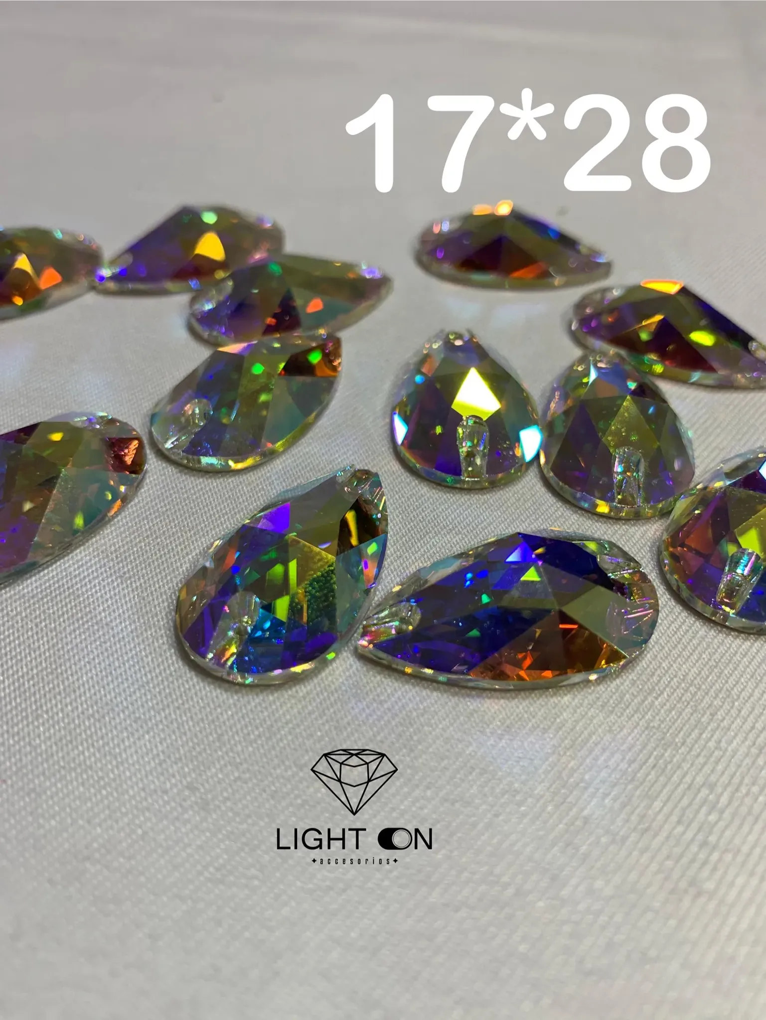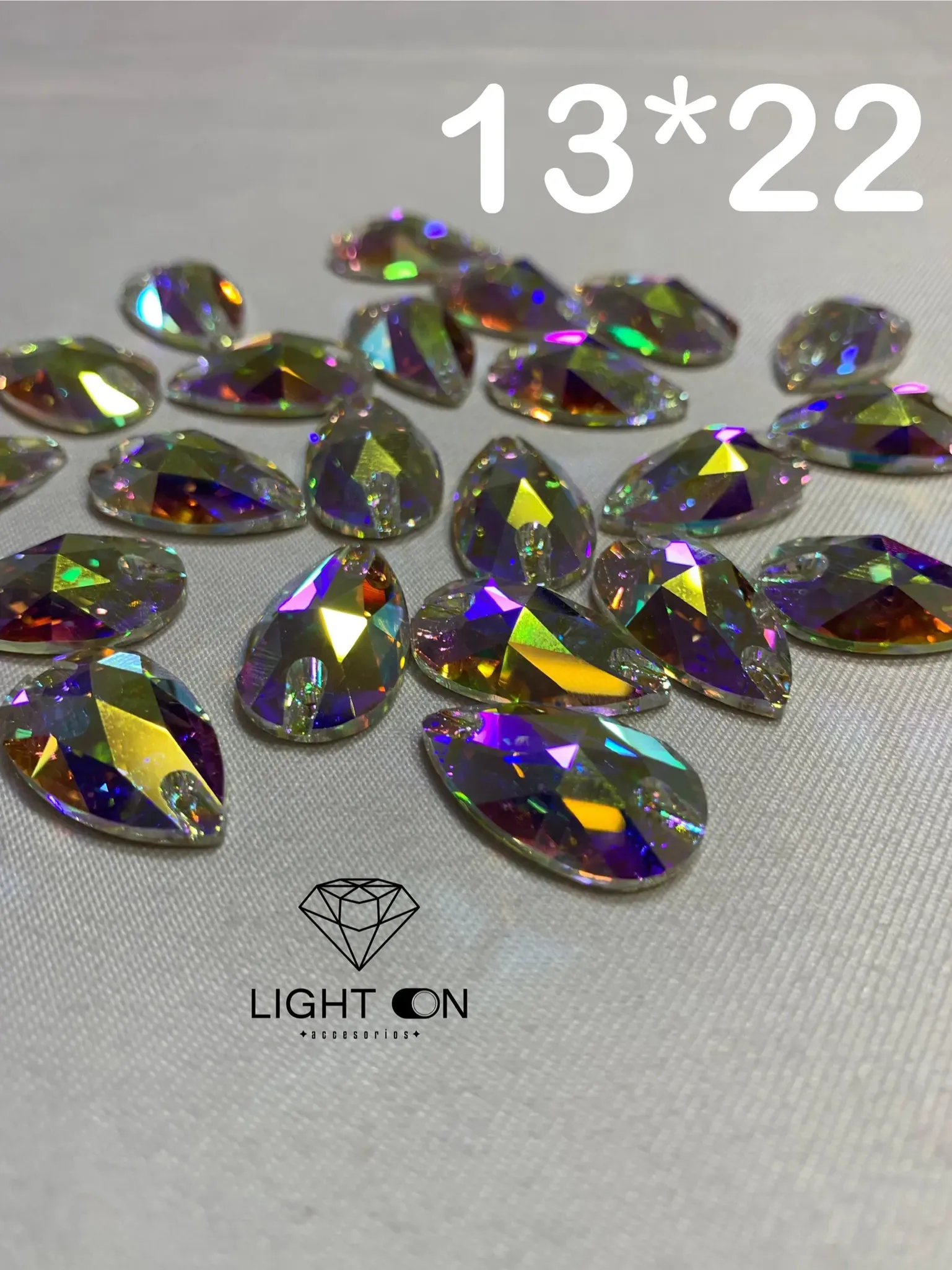Nuestra hermosa pedrería vidrio lágrima tornasol en diferentes medidas 10*18, 13*22, 17*28.