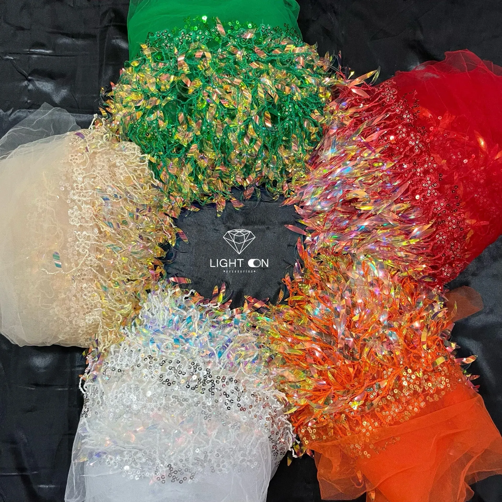 Tela brillante de lentejuelas en varios colores por metro, ideal para confeccionar prendas y accesorios llamativos. Añade un toque de brillo y elegancia a tus creaciones. Producto de alta calidad disponible en light on accesorios.
