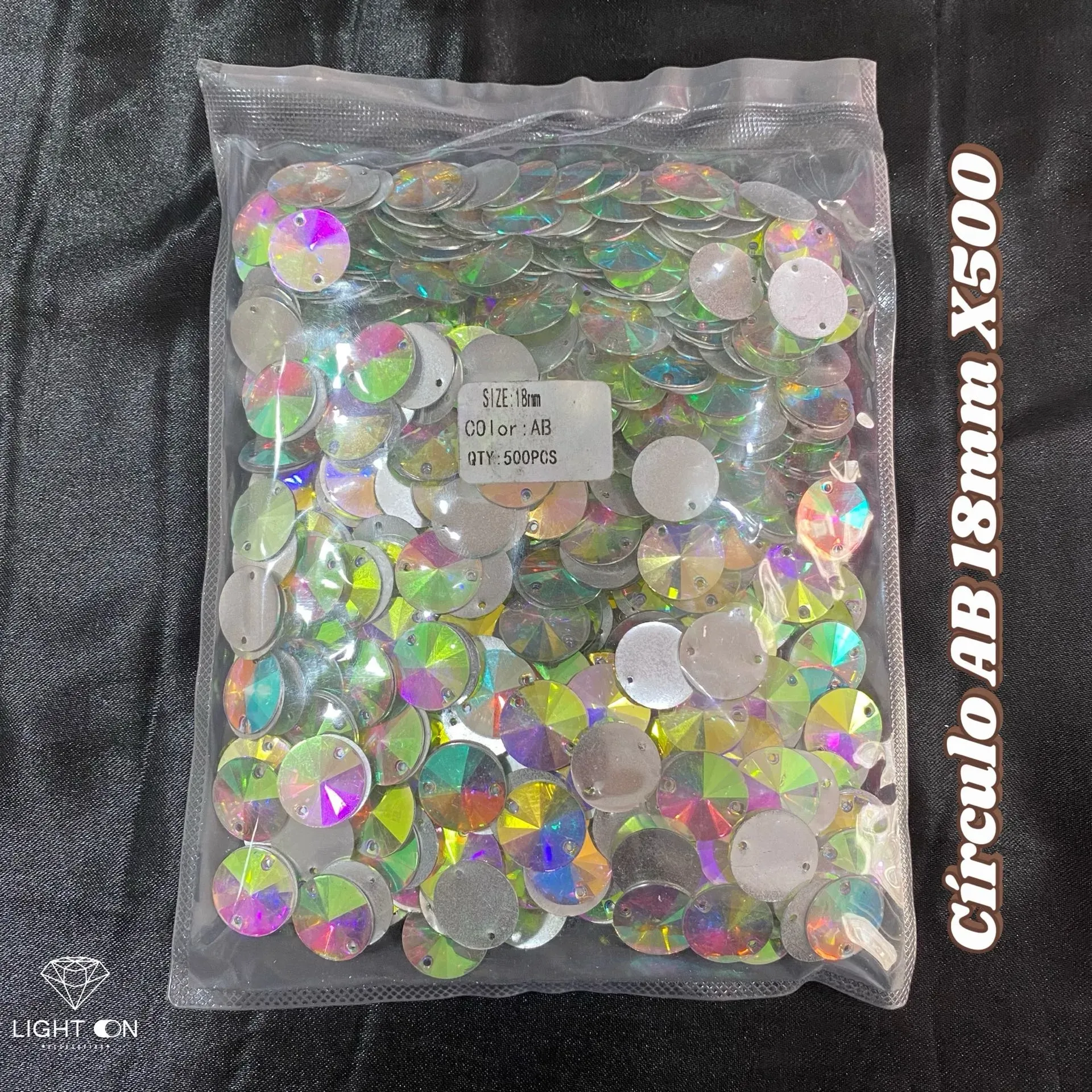 Paquete de 500 unidades de pedrería plástica Bella Stone en forma de círculo de 18mm con efecto tornasol, ideal para manualidades y decoración. Producto de alta calidad y brillo, perfecto para dar un toque especial a tus creaciones.